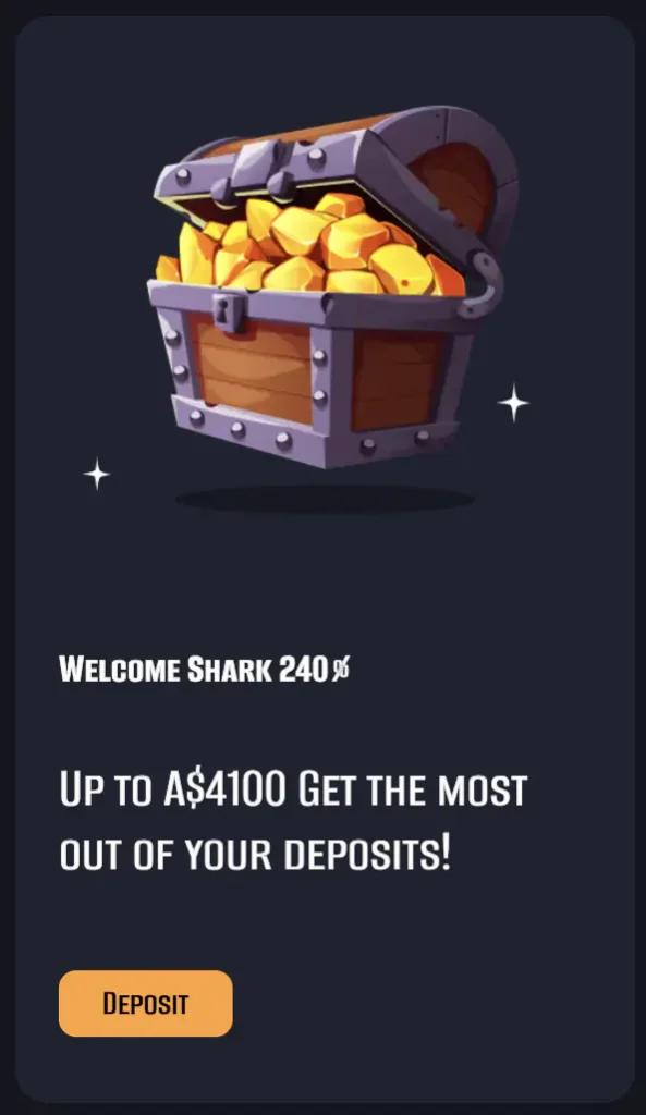 Upon signing up for a new account at WinShark casino online, you get to receive a wonderful welcome bonus offer. WinShark Casino offers a 240% welcome bonus of up to C$3550 plus 300 free spins. The bonus offer is claimable over 3 deposit stages.