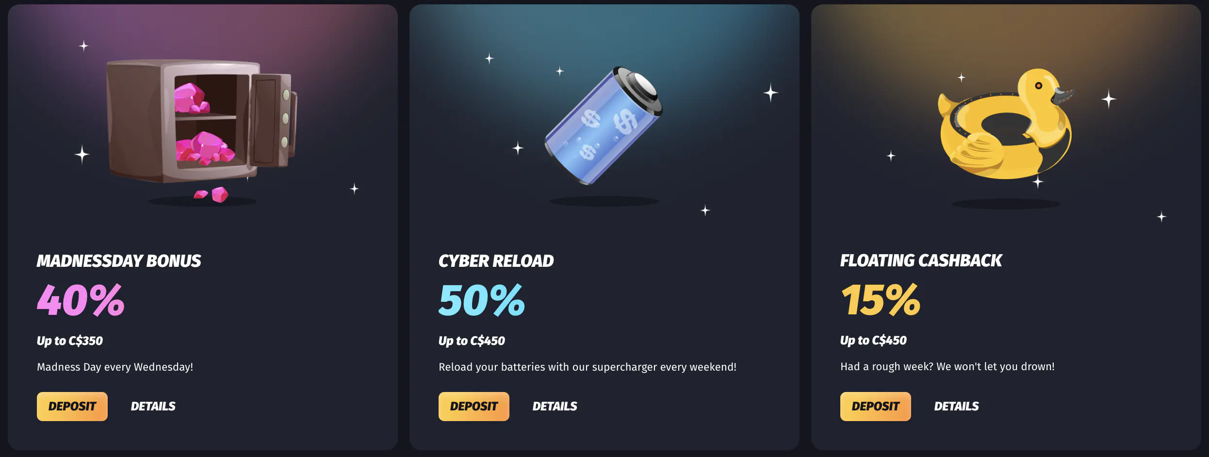 WinShark Cyber Reload bonus is open to punters every week between Friday and Sunday. The reload bonus offers 50% of up to C$450 when a user makes a minimum deposit of $30.