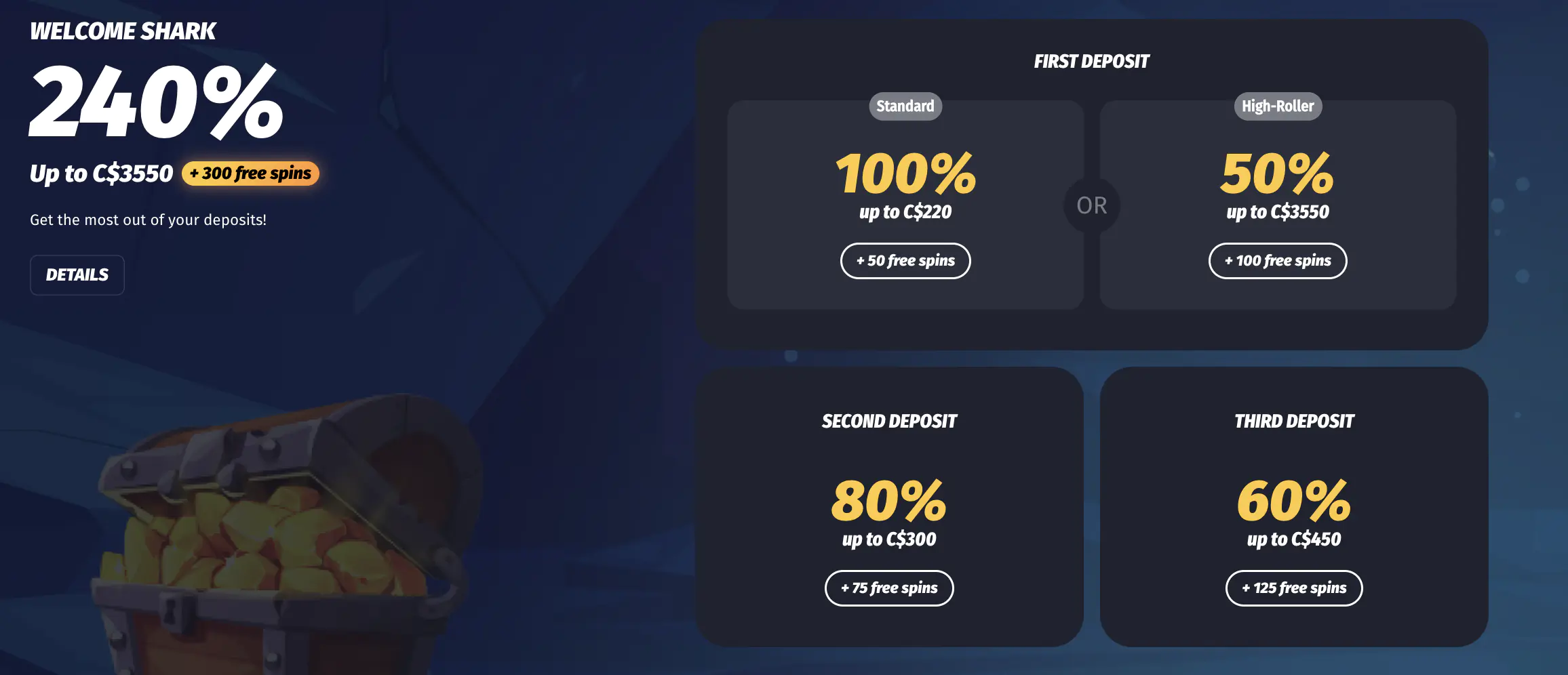 Upon signing up for an account at WinShark Casino, you get to claim a 240% welcome bonus of up to C$3550 plus 300 free spins. This WinShark bonus is claimable over three deposit stages.